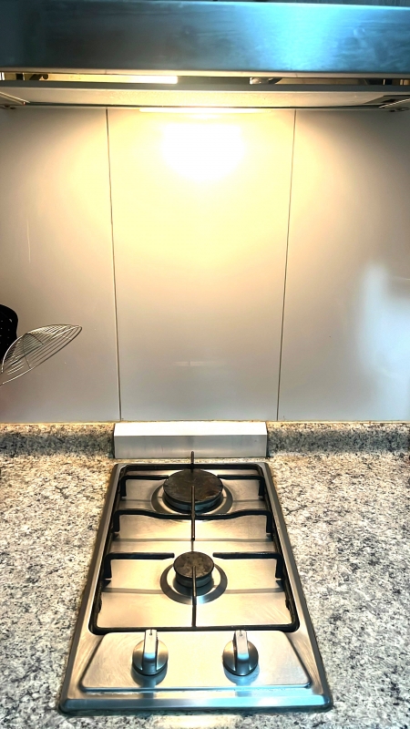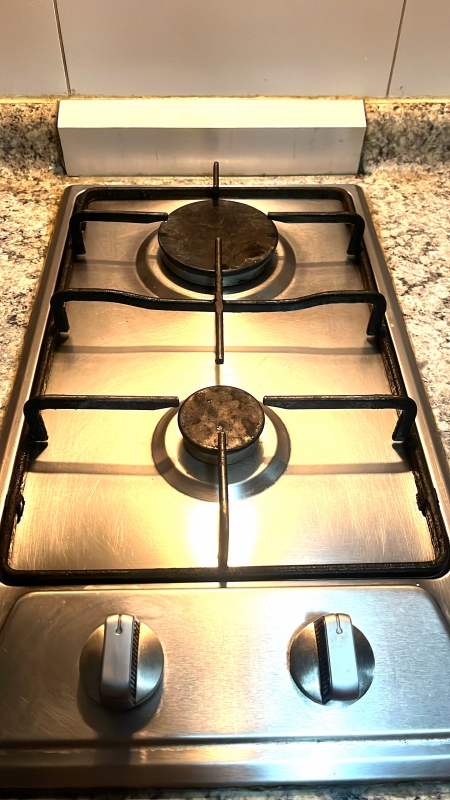 1 cocina americana con lavaplatos de acero inoxidable con grifería monomando, equipada con campana (para absorber olores) y horno eléctrico empotrados y encimera de dos platos a gas con llave de paso de gas a la vista, los 3 artefactos de acero inoxidable, y con gran cantidad de mobiliario y mesa de diario (para evitar usar espacio en comedor y living).