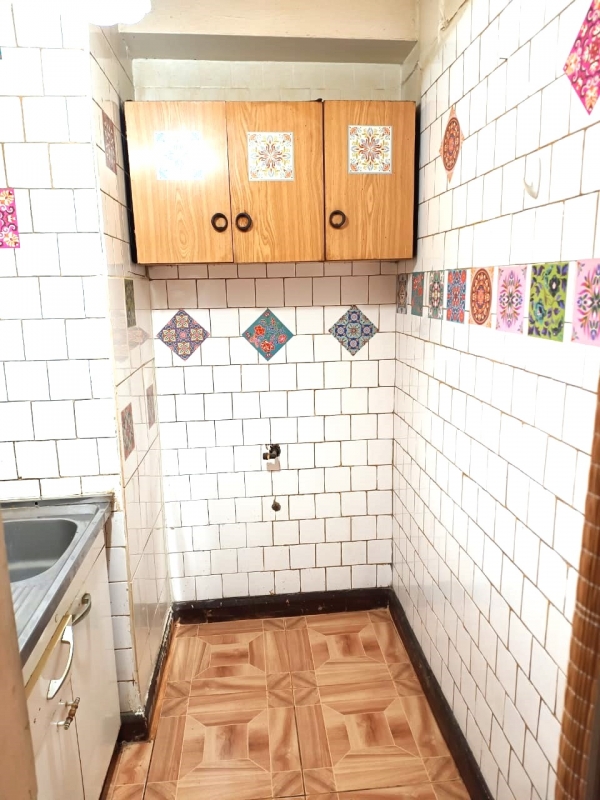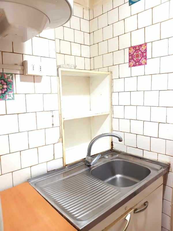 Cocina tradicional dos platos, ventilación, muebles, piso cerámica
